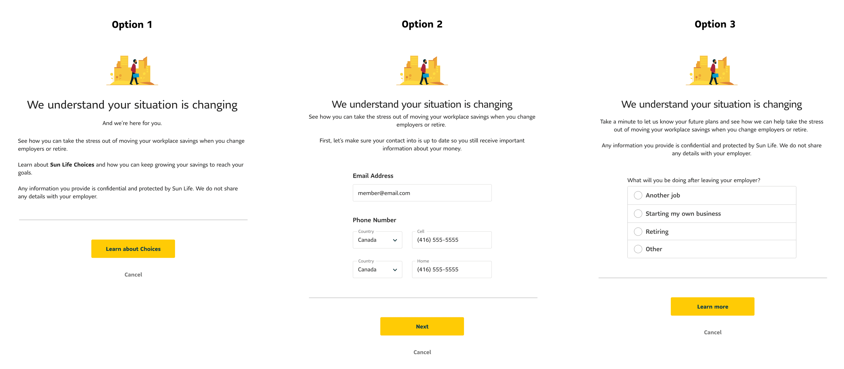 Knowing that our customers are visiting this page due to major changes in their employment situation, we had to ensure a sensitive approach. Some customers may be just retiring however others could have just been laid off or terminated and have come to the Choices product to manage their investments. User testing was instrumental when choosing how to handle this situation and make sure our customers felt supported and respected. After a round of tests we had a clear answer and could confidently move on to refining this product.