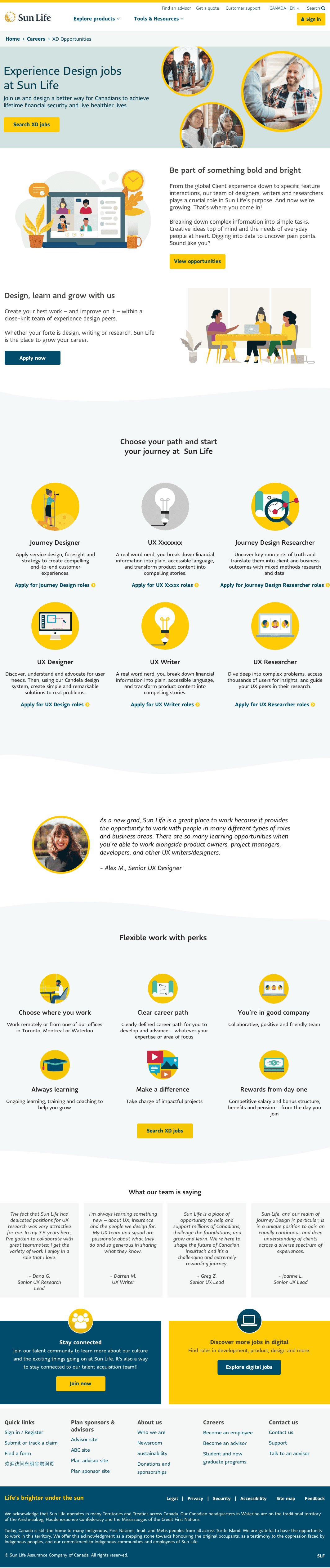 As Sun Life grew it recognized the importance of client satisfaction in a holistic way. This included user experience through intelligent and intuitive design. The company started investing in and growing its creative branch as its focus started to grow beyond just the customer experience. It needed to capture the attention of all that great creative talent outside its doors, and show them all the perks of working at SLF. A Design Experience recruiting microsite was born. In 2022 the page needed to be refined and expanded to capture new roles.